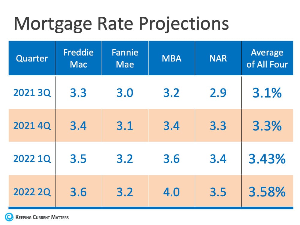 Another significant factor that should inform your decision is mortgage interest rates. Today’s average rates remain close to record lows. Much like prices, though, experts forecast rates will rise over the coming months, as the chart below shows: